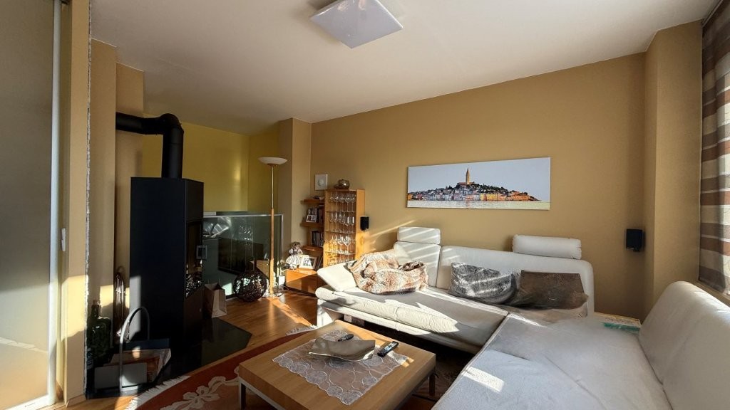 Das gemütliche Wohnzimmer verfügt über einen energiesparenden Ofen für feste Brennstoffe.